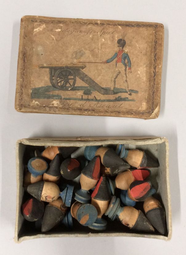 Kartonnen doosje met uit hout gesneden soldatenkopjes, onderdeel van bordspel genaamd belegeringsspel
