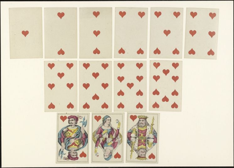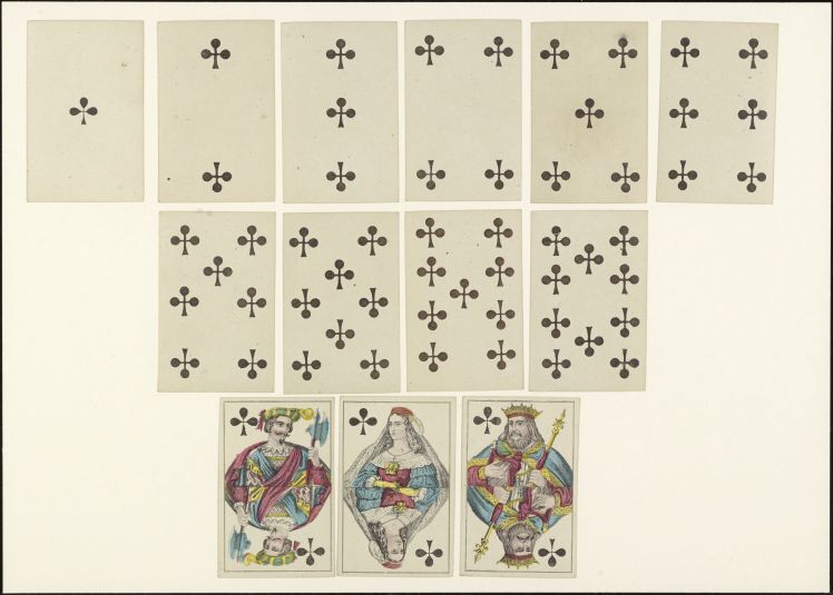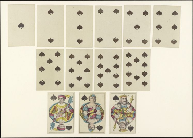 Kaarten die worden gemaakt in pakketten van een bepaald aantal en die zijn gemerkt om te worden gebruikt als spelonderdelen tijdens het spel; de merktekens of ontwerpen kunnen een bepaald kleur- of rangensysteem volgen of speciaal en meer specifiek zijn. (AAT-Ned) https://data.cultureelerfgoed.nl/term/id/cht/ec404b95-e035-4711-8179-7507d6407d4e