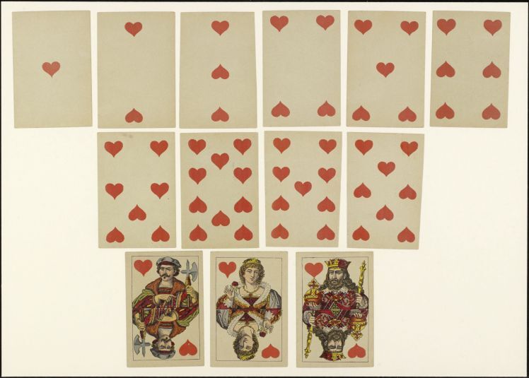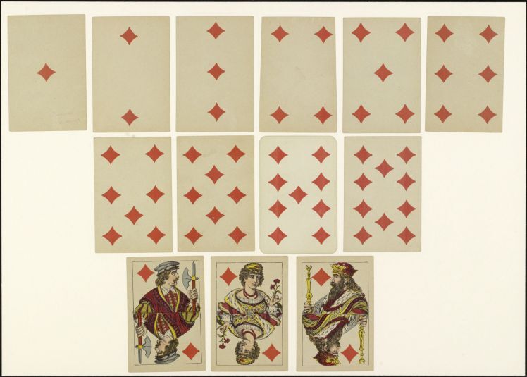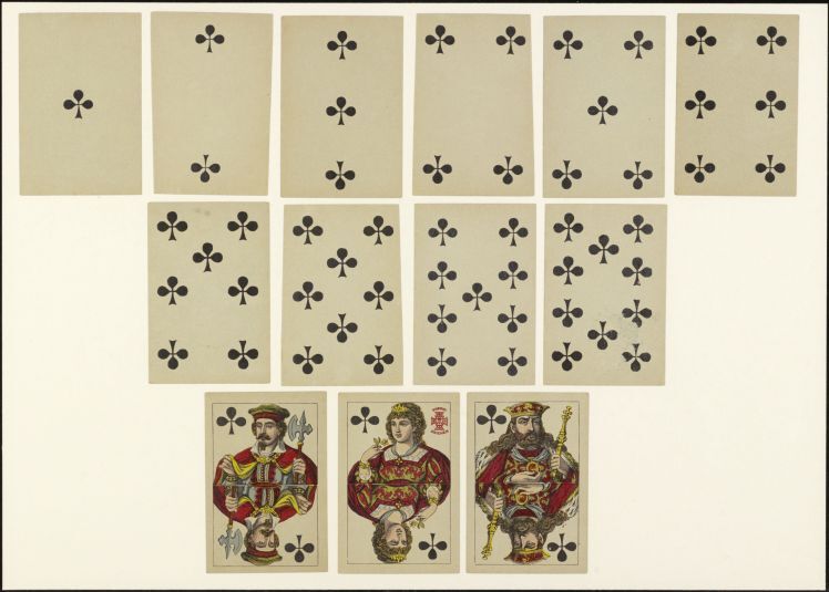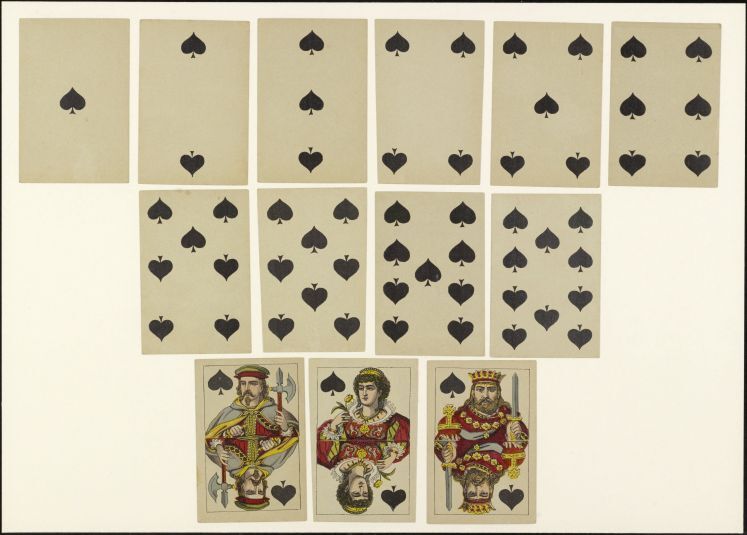 Kaarten die worden gemaakt in pakketten van een bepaald aantal en die zijn gemerkt om te worden gebruikt als spelonderdelen tijdens het spel; de merktekens of ontwerpen kunnen een bepaald kleur- of rangensysteem volgen of speciaal en meer specifiek zijn. (AAT-Ned)