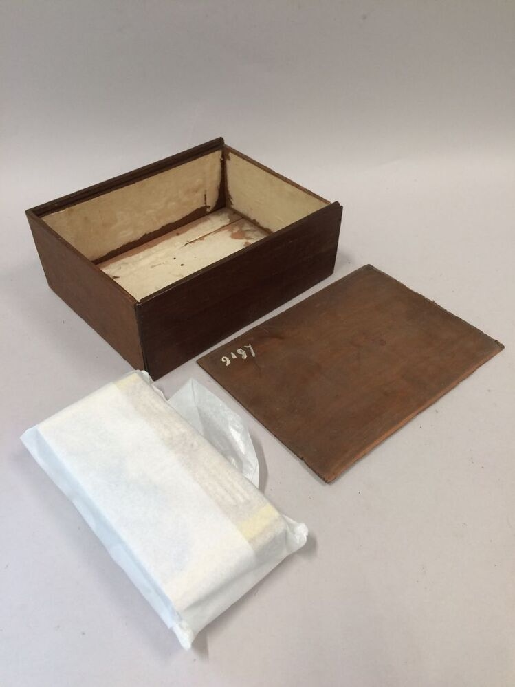 Circa 30 platen in doos, onderdeel van mahoniehouten stereoscoop met platen in doos