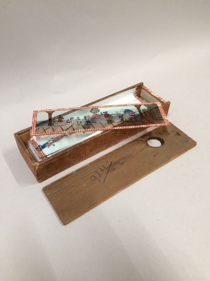 Doosje met elf beschilderde glazen toverlantaarnplaten