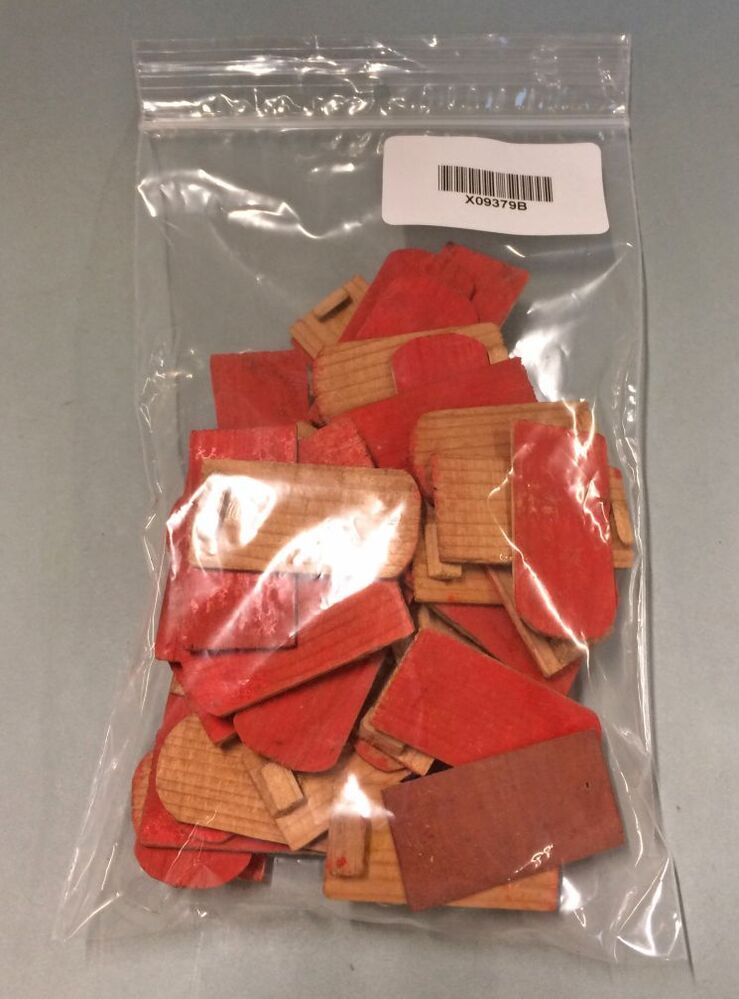 Zakje met een verzameling losse bouwstenen, onderdeel van bouwdoos en zakje met losse onderdelen