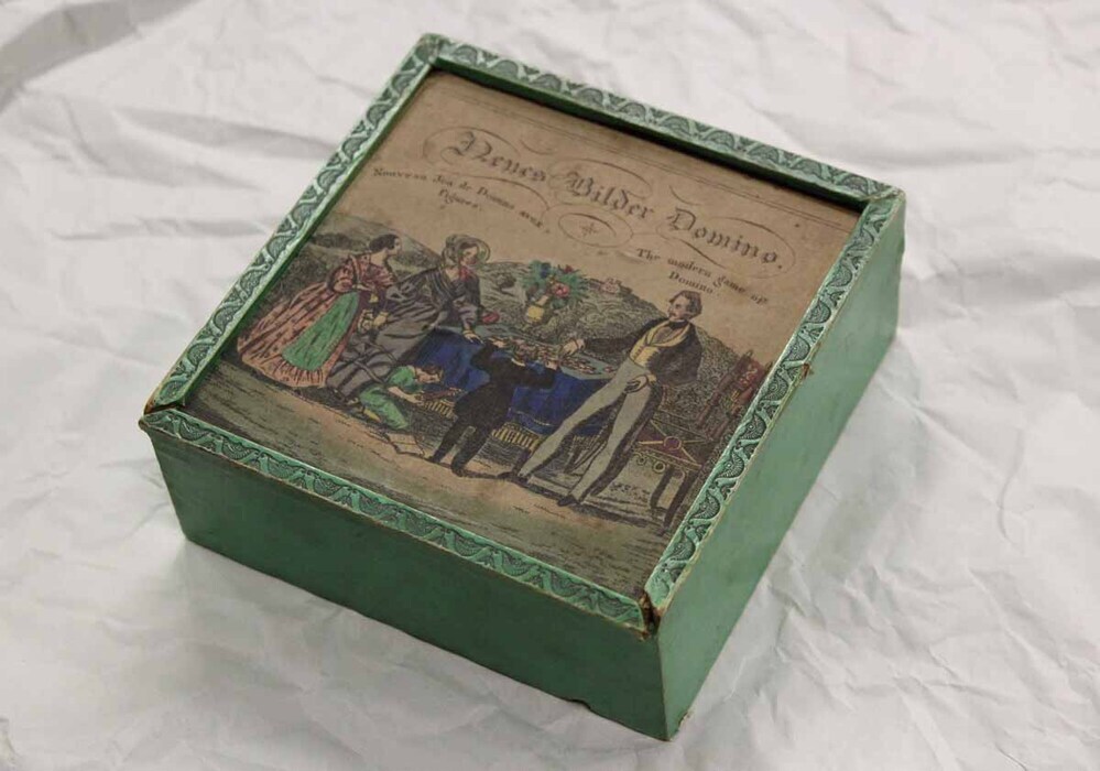 Houten doosje met groen papier beplakt met dominospel, met voorstellingen, New Bilder Domino