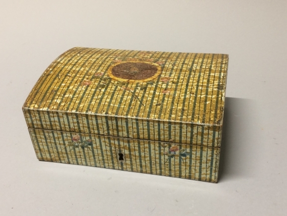 Houten doosje met geel-groen strepen en rozenmotief