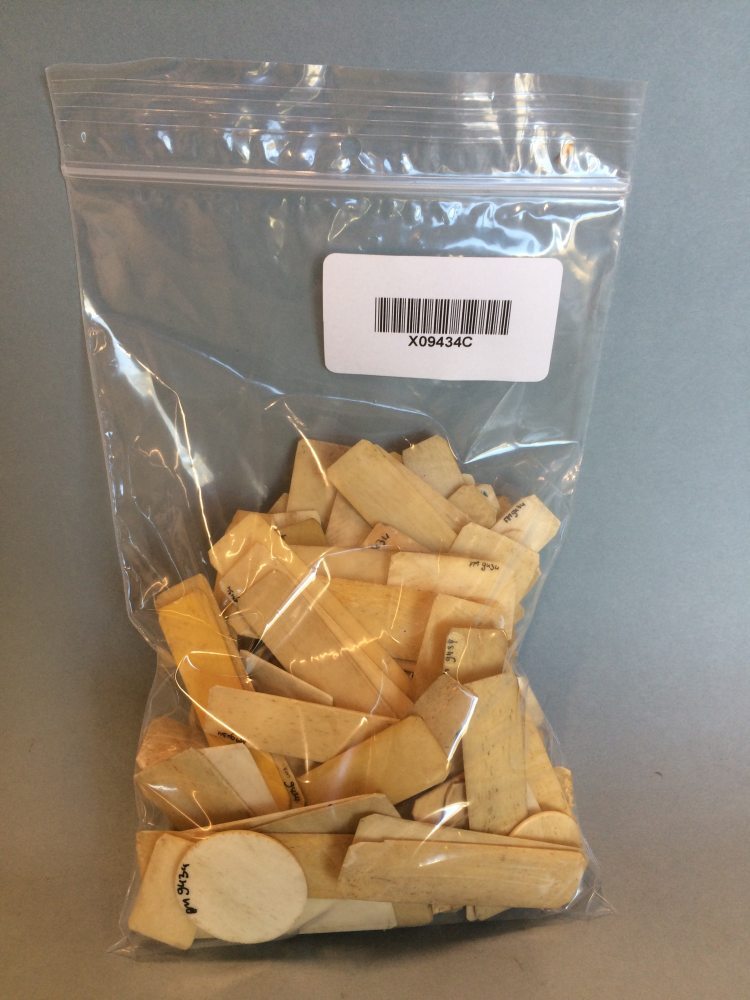 Zakje met 160 witte fiches, onderdeel van kansspel in vier zakjes met rode en witte fiches en twee kartonnen doosjes