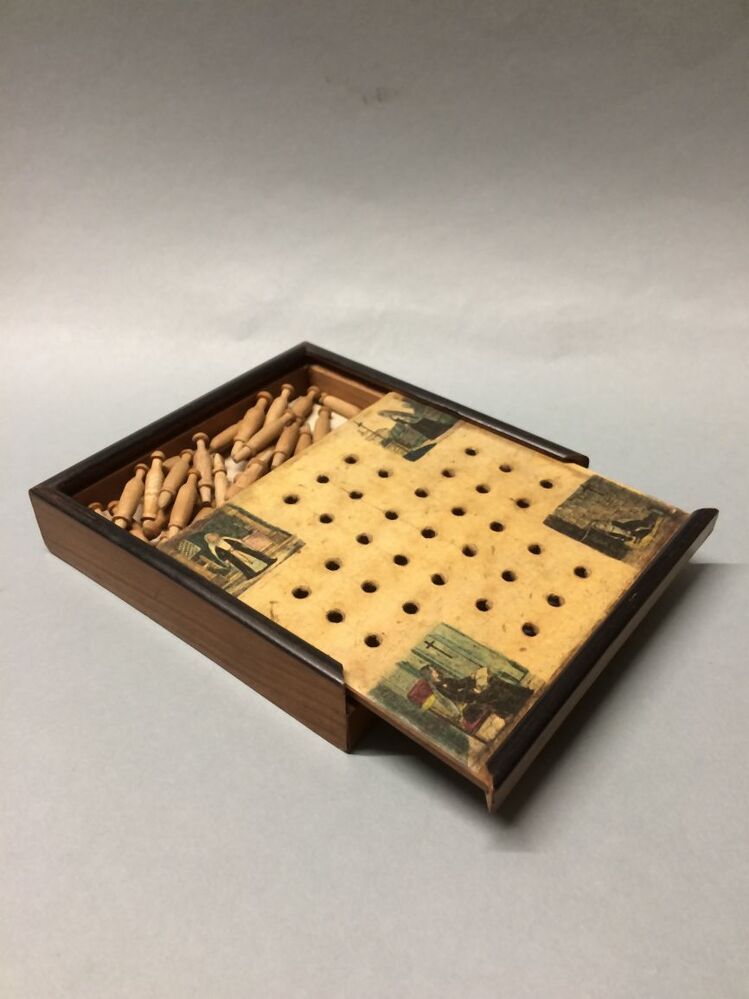 Solitairspel in doos met schuif, waarin de gaatjes, in het doosje de pionnetjes