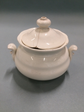 Soepterrine met deksel, onderdeel van wit poppenservies van Wedgwood, bestaande uit 24 delen