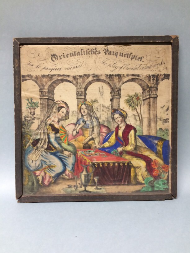 Mozaiek, bestaande uit legkaart met gekleurde houtjes in doos met deksel