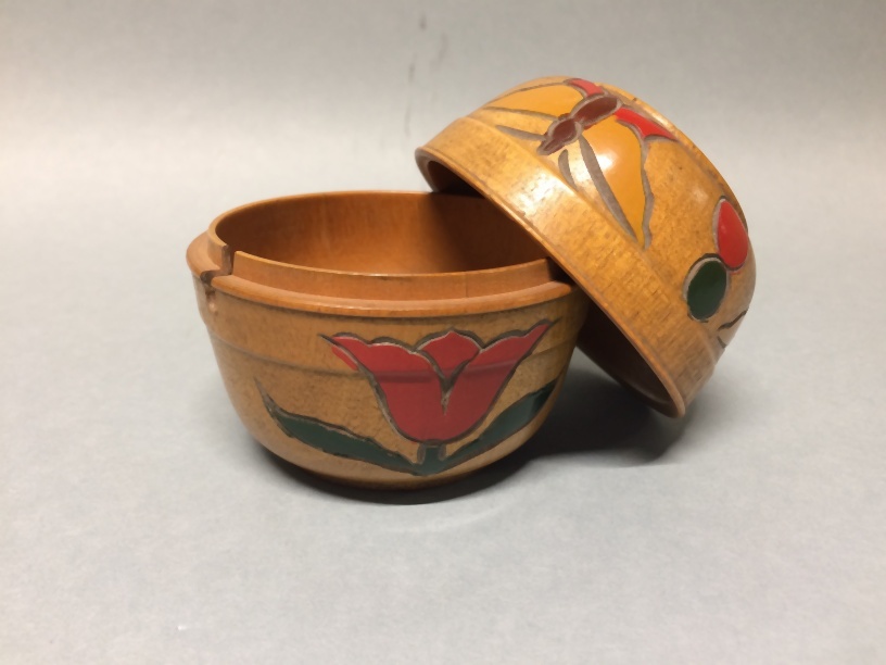 Twee met tulpen en vlinders beschilderde houten kommen die op elkaar passen (doordat hout is gaan werken niet meer)