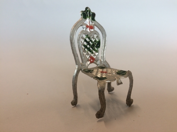 Stoel, 1 van 10, onderdeel van doos met tinnen poppenmeubeltjes