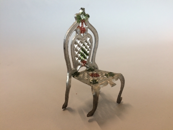 Stoel, 1 van 10, onderdeel van doos met tinnen poppenmeubeltjes
