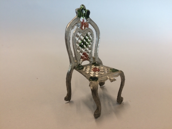 Stoel, 1 van 10, onderdeel van doos met tinnen poppenmeubeltjes