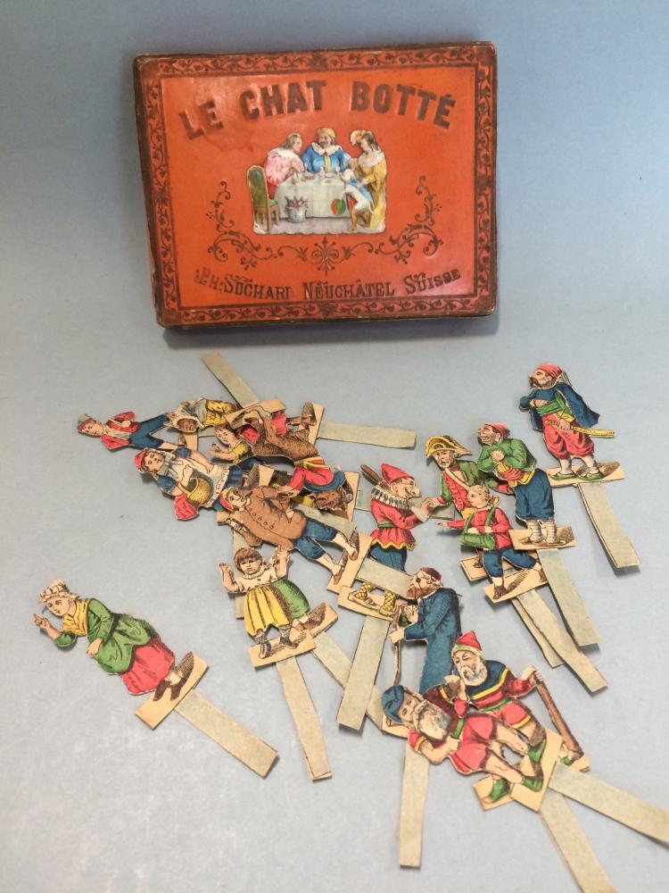 Rood geschilderd kartonnen doosje waarin uitgeknipte poppetjes, de gelaarsde kat