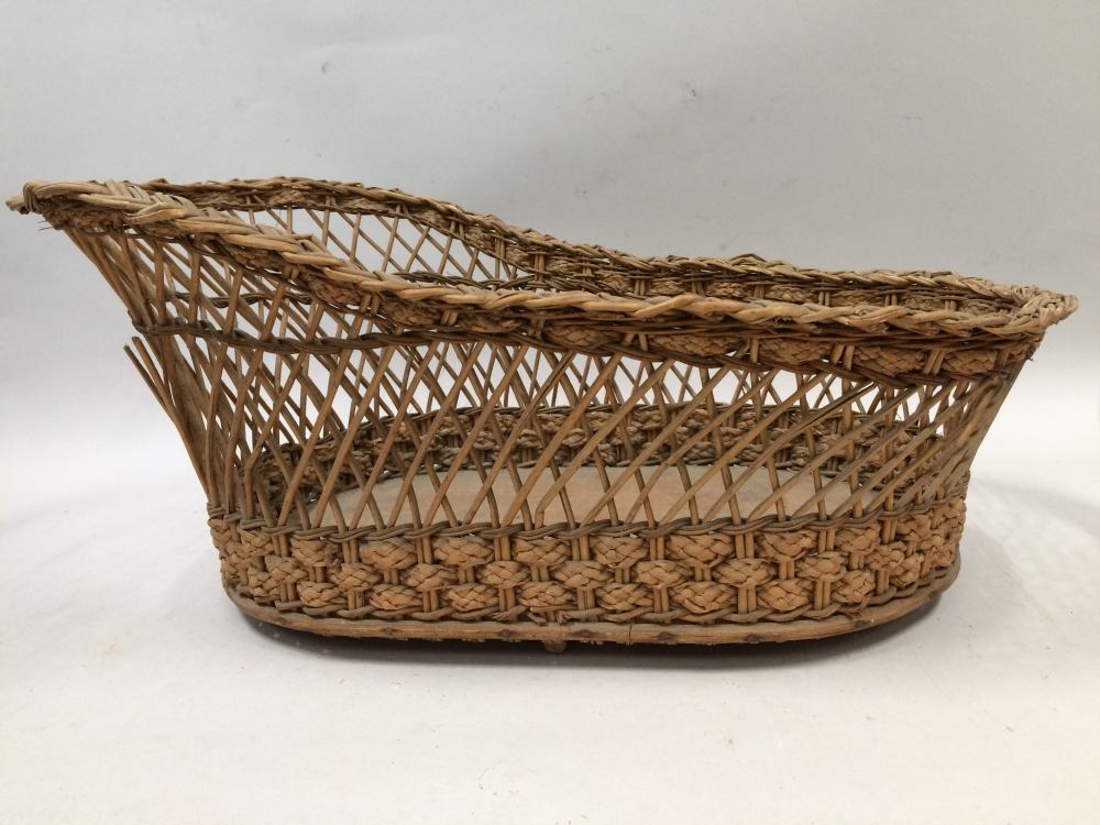 Poppenwieg van gevlochten teen met houten bodem, de rand loopt aan het hoofdeinde iets omhoog.