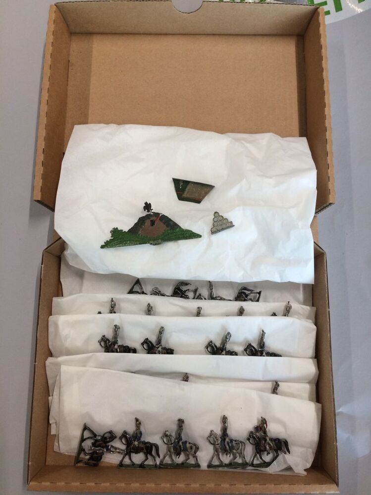 Kartonnen bonbondoos waarin 23 tinnen ruiters (Ulanen), kazemat en boom.