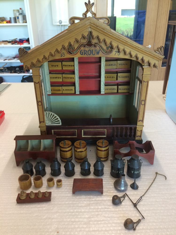 Klein kruidenierswinkeltje, onderdeel van kruidenierwinkeltje op tafeltje met driepoot, op het Fries geschilderd: 'Grouw' 1875