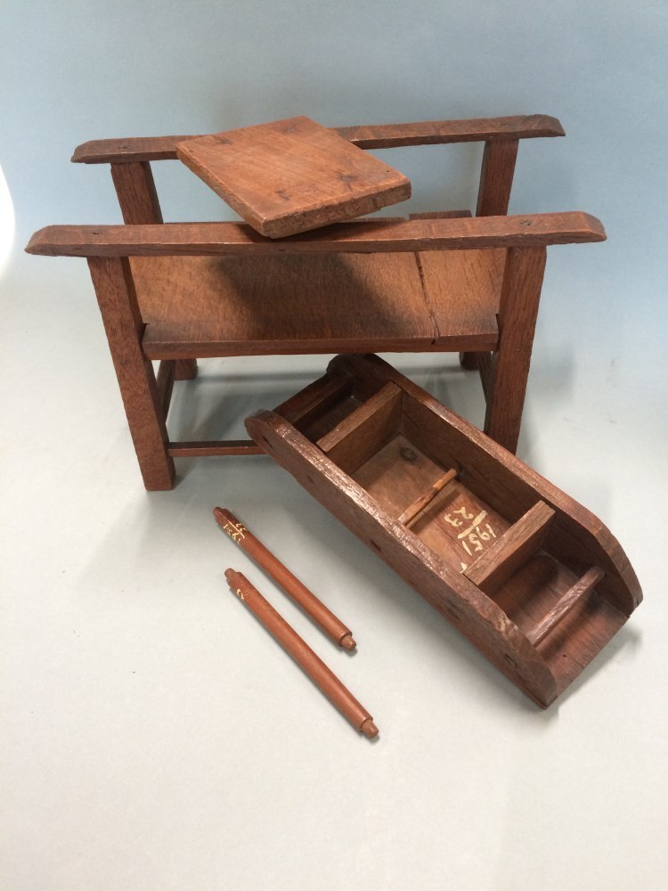 Miniatuur trekmangeltje van eikenhout bestaande uit tafel, 2 rollen en rolbank