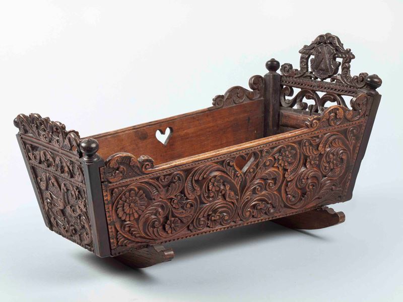 Notenhouten Hindelooper wiegje, versierd met het wapen van de stad Hindeloopen en van de familie Sandberg