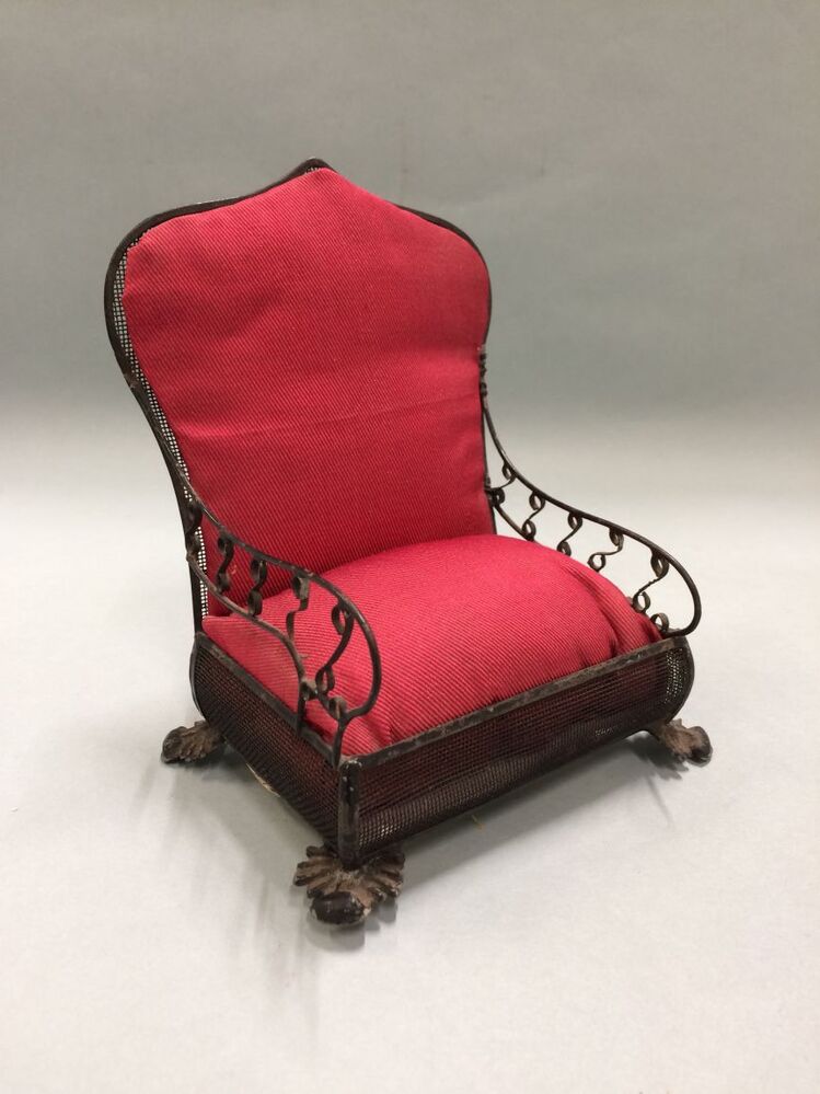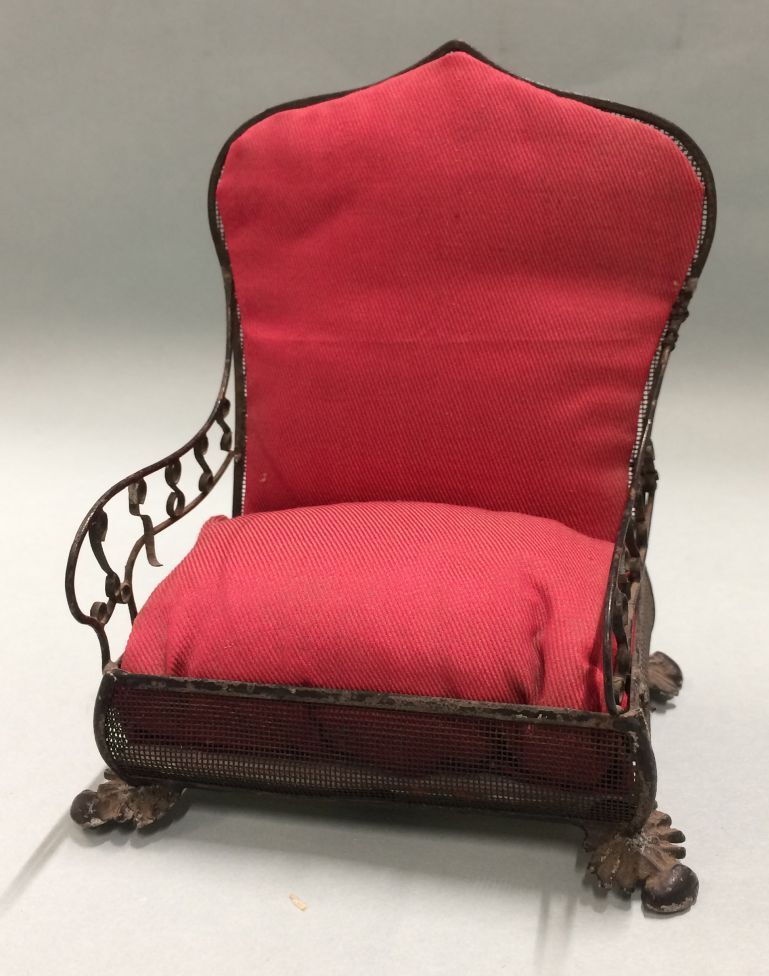 Zwartgelakte blikken fauteuil, met rode stof bekleed, rustend op vier lage pootjes
