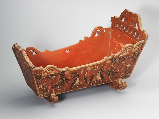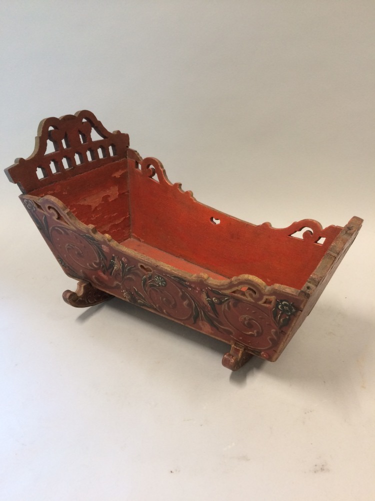 Houten wiegje in Hindelooper kleuren beschilderd, op bruin rood fond bloem en blad krullen en vogeltjes, op een der zijden ID