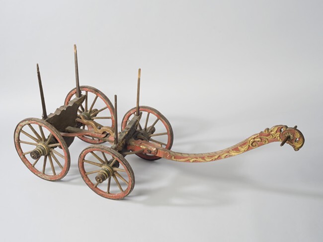 Onderstel, onderdeel van kinderwagentje op fraai besneden onderstel, de trekstang langwerpig S-vormig eindigend in een vogelkop