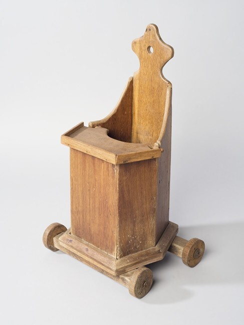 Kleine eikenhouten kinder- of poppenkakstoel op vier houten wieltjes