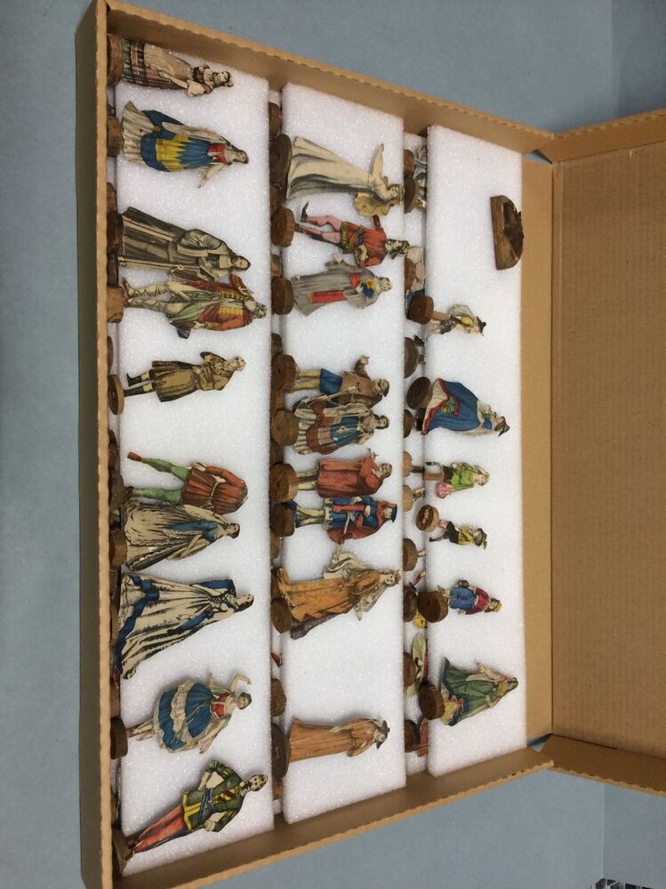 Vierenvijftig kartonnen speelfiguurtjes, onderdeel van kindertoneel met voorstuk, achtergronden, coulissen en toneelfiguren