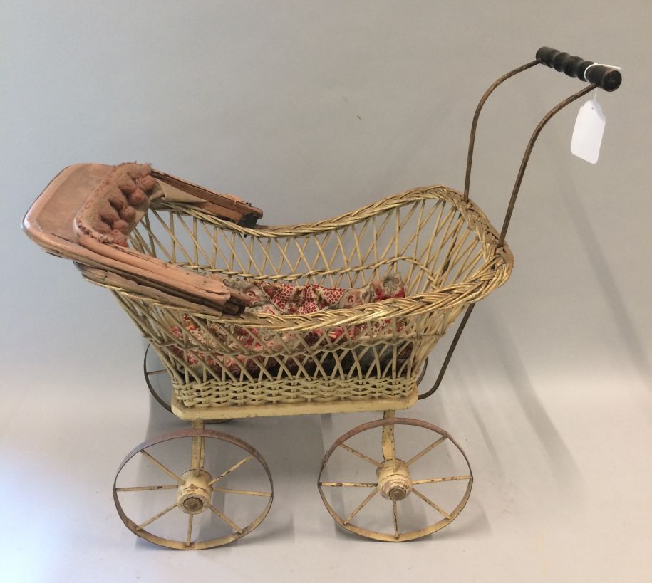 Poppewagentje met bak van hol gevlochten tenen, onderdeel van groep van tien