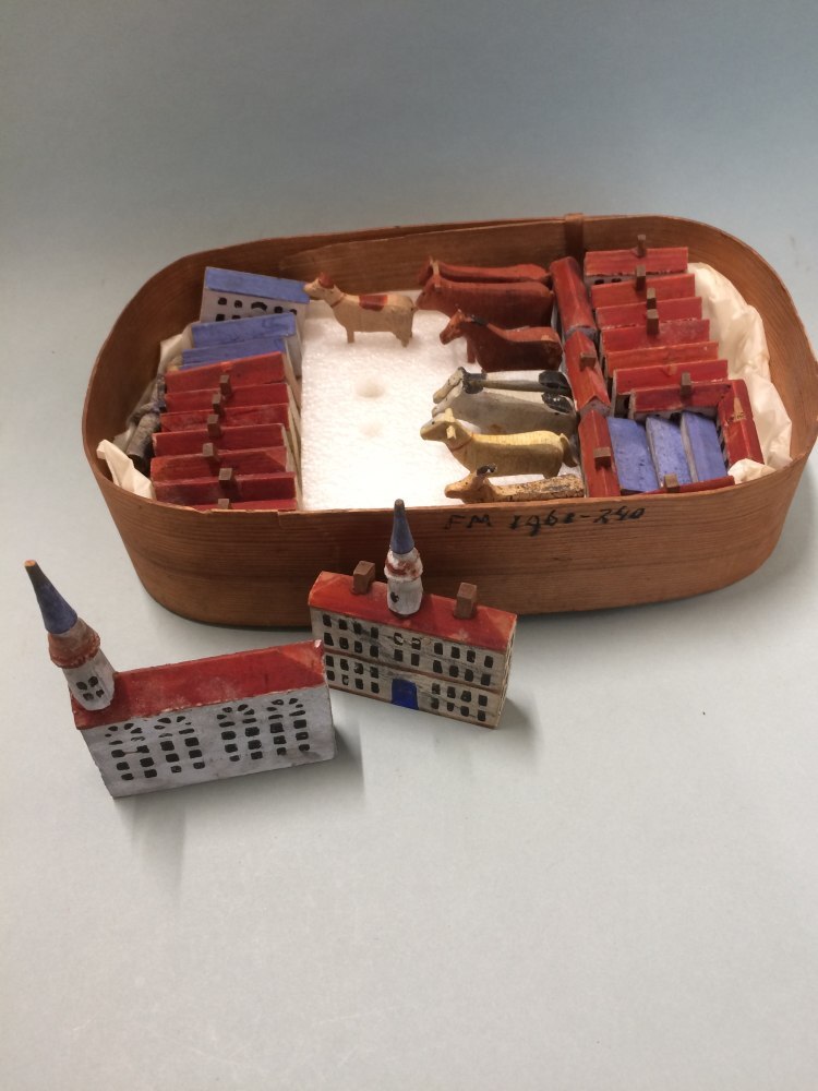 Stomp ovale blank spanen doos zonder deksel, waarin 26 delen van dorp