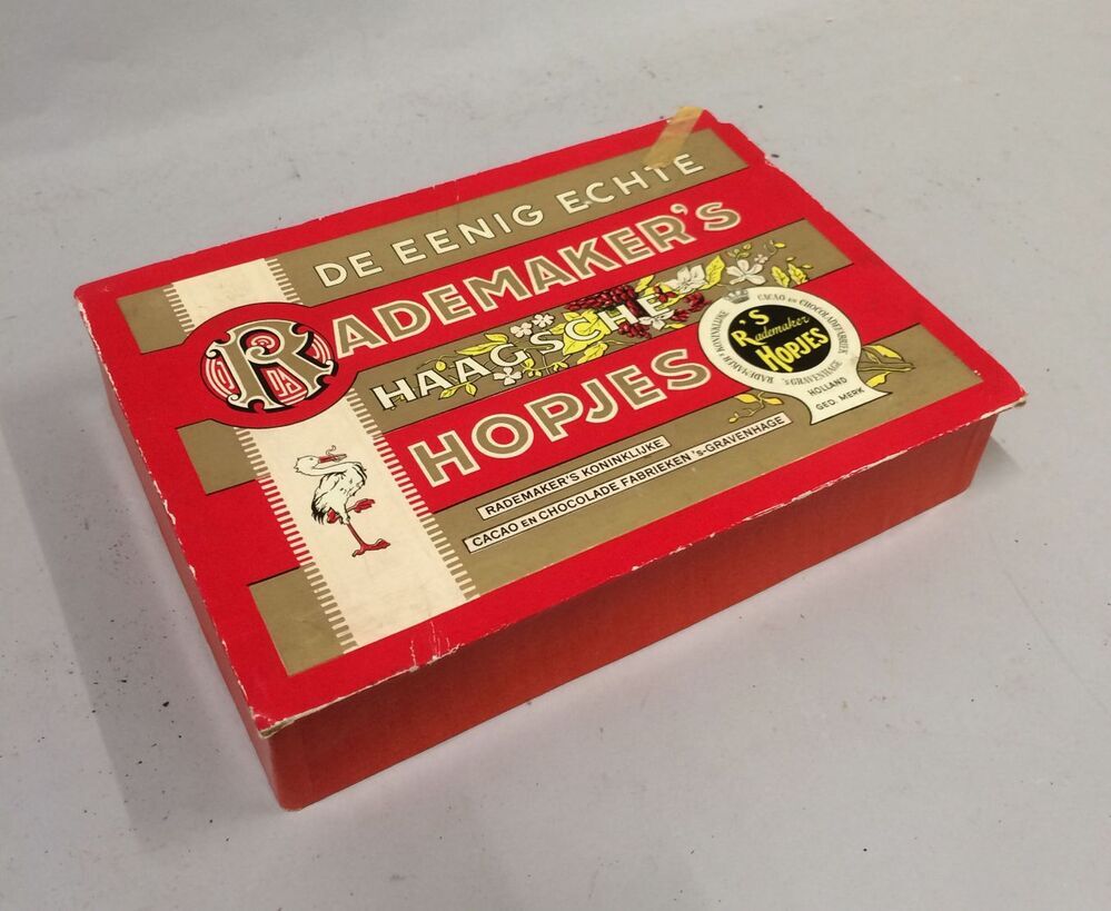 Kartonnen Rademakers hopjes doos, onderdeel van Kartonnen Rademakers hopjes doos met 10 geklede popjes van porselein