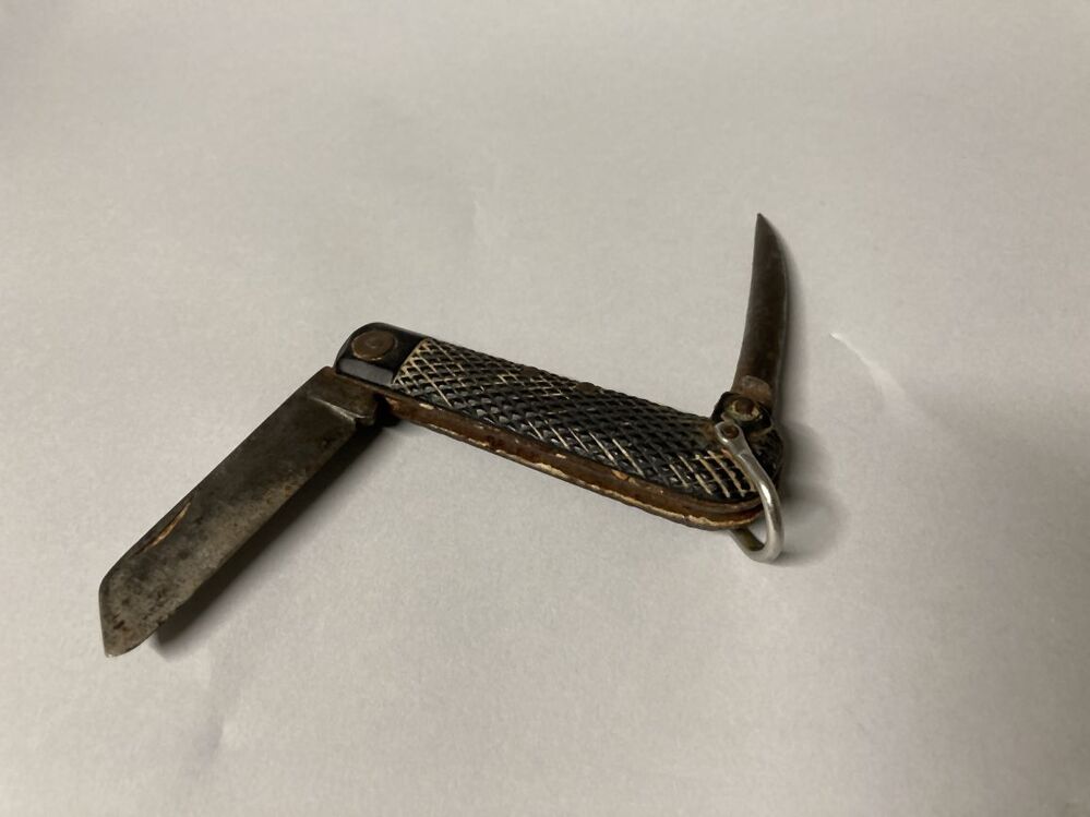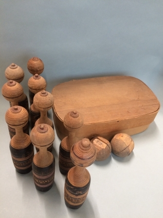 Kegelspel bestaande uit negen houten kegels met zwarte en paarse banden, twee houten werpballen en bijbehorende opbergdoos