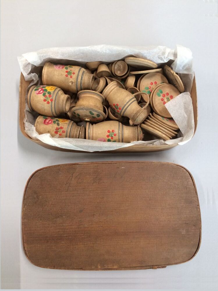 Spanen doos met deksel met gedraaid en geverfd houten miniatuur kinderservies