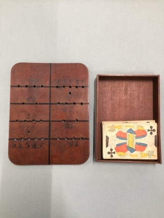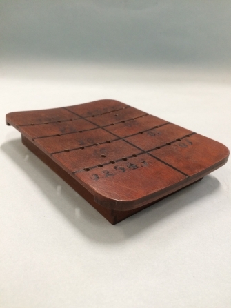 Houten punten-noteertafel gebruikt bij een kaartspel dat in schuiflade zit