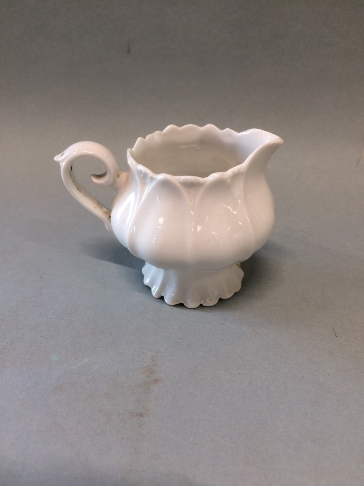 Melkkan, onderdeel van wit porseleinen kinderserviesje, bestaande uit: trekpotje, melkkannetje, suikerpotje, 6 kop en schotels