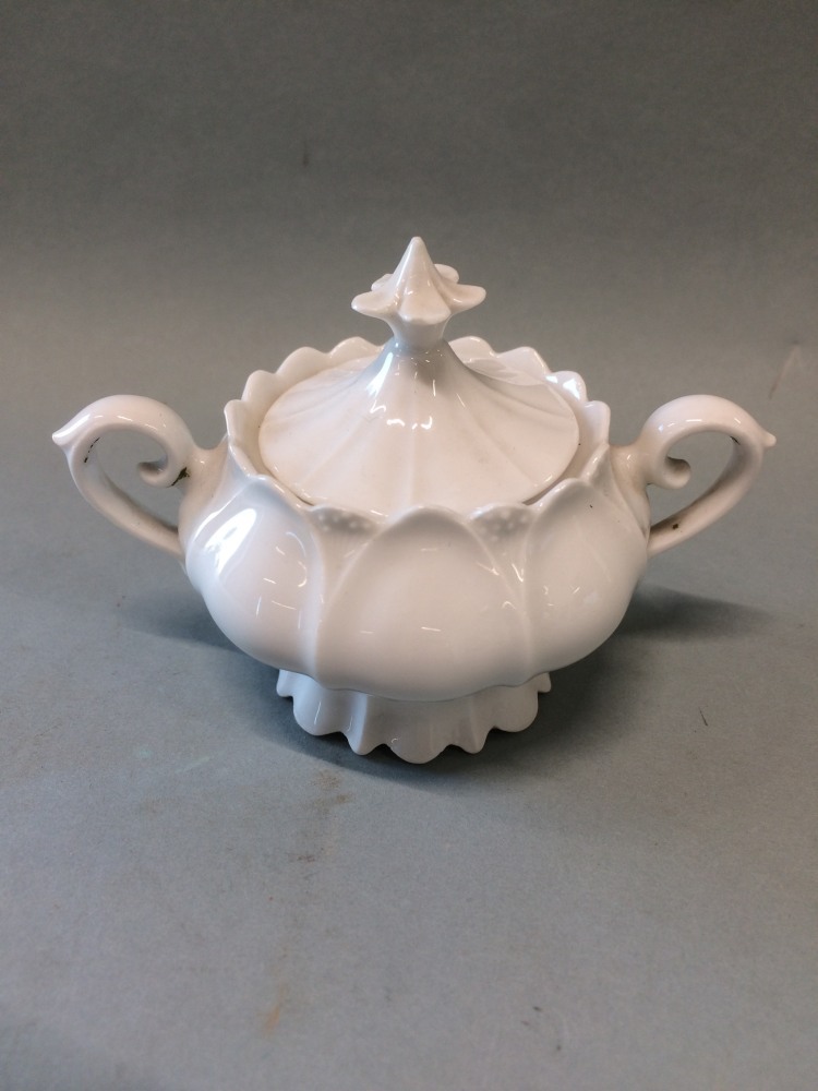 Suikerpot, onderdeel van wit porseleinen kinderserviesje, bestaande uit: trekpotje, melkkannetje, suikerpotje, 6 kop en schotels