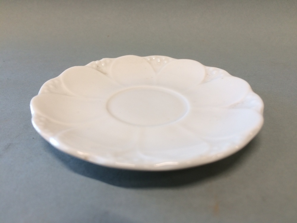 Schotel, onderdeel van wit porseleinen kinderserviesje, bestaande uit: trekpotje, melkkannetje, suikerpotje, 6 kop en schotels