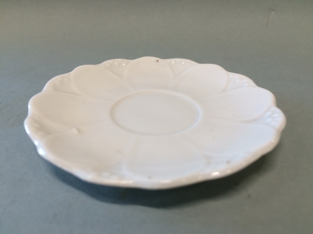 Schotel, onderdeel van wit porseleinen kinderserviesje, bestaande uit: trekpotje, melkkannetje, suikerpotje, 6 kop en schotels