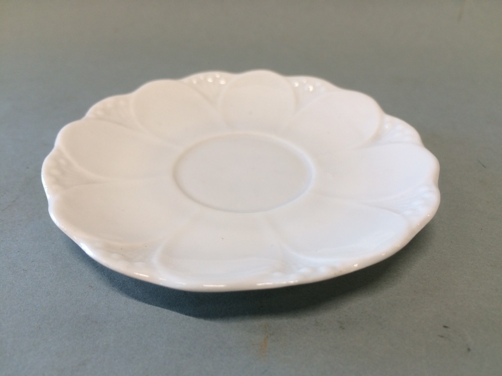 Schotel, onderdeel van wit porseleinen kinderserviesje, bestaande uit: trekpotje, melkkannetje, suikerpotje, 6 kop en schotels