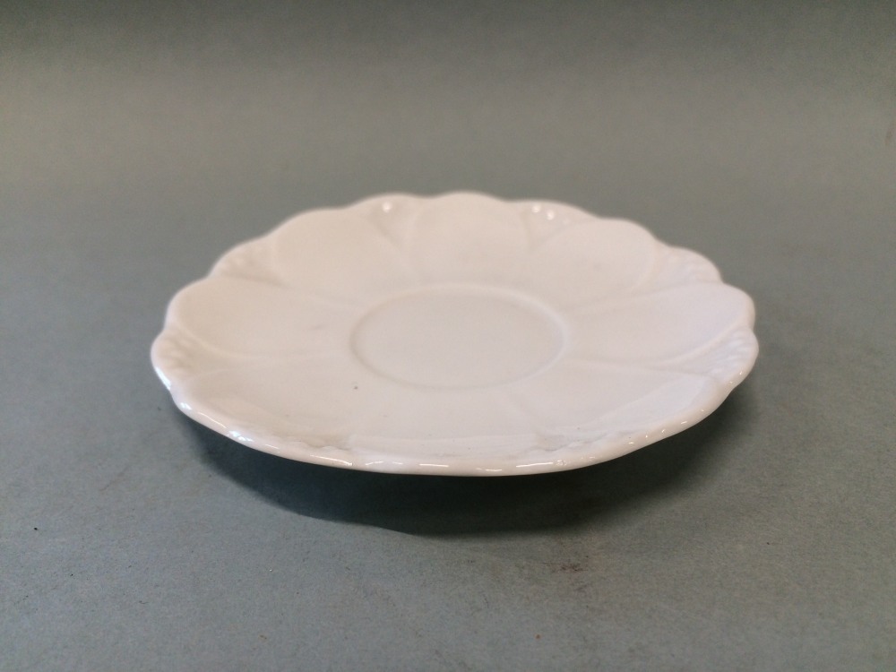Schotel, onderdeel van wit porseleinen kinderserviesje, bestaande uit: trekpotje, melkkannetje, suikerpotje, 6 kop en schotels