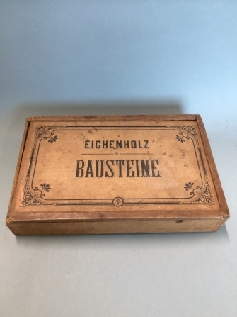 Bouwdoos, vurenhouten doos met schuifdeksel, op het deksel een papier geplakt waarop gedrukt: Eichenholz Bausteine