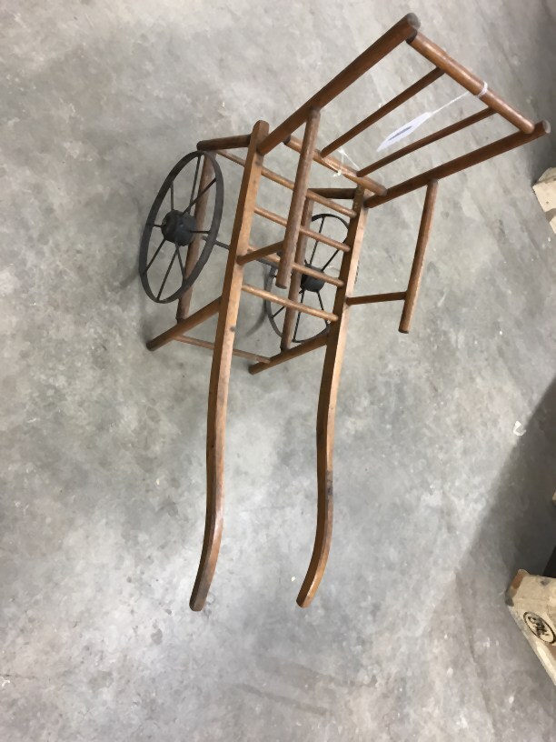 Sportkarretje voor een pop, rijdend op 2 ijzeren gespaakte wielen, de opbouw en duwstangen van hout
