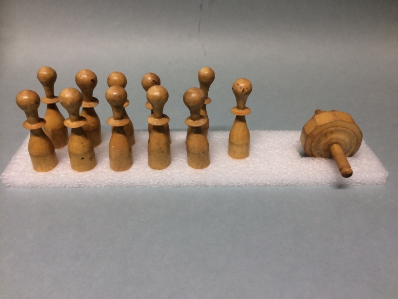 Elf kleine houten kegels en een draaitafel