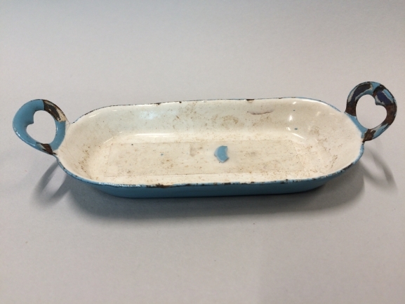 Braadslede met lichtblauwe email, onderdeel van drie rechthoekige braadsledes met oren
