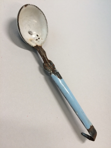 Pollepel, onderdeel van koekenpan, steelpan en pollepel met lichtblauwe email
