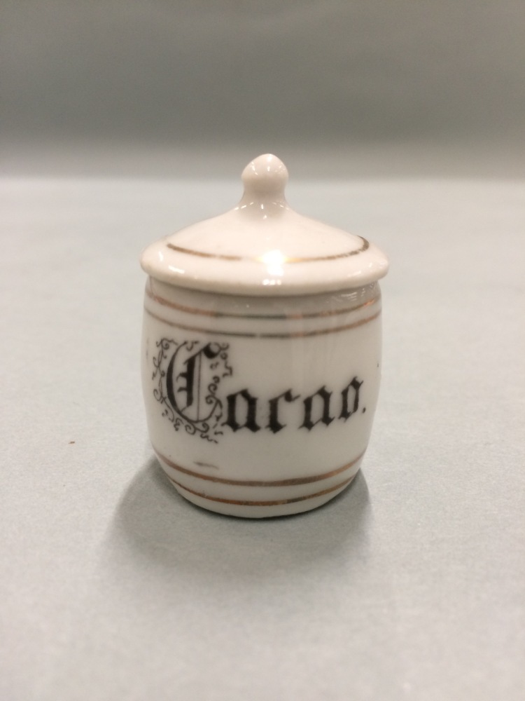 Voorraadvat met deksel met het opschrift Cacao, onderdeel van vijf porseleinen miniatuur voorraadvaatjes met deksels met opschriften