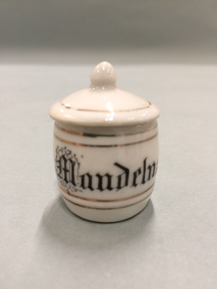Voorraadvat met deksel met het opschrift Mandeln, onderdeel van vijf porseleinen miniatuur voorraadvaatjes met deksels met opschriften