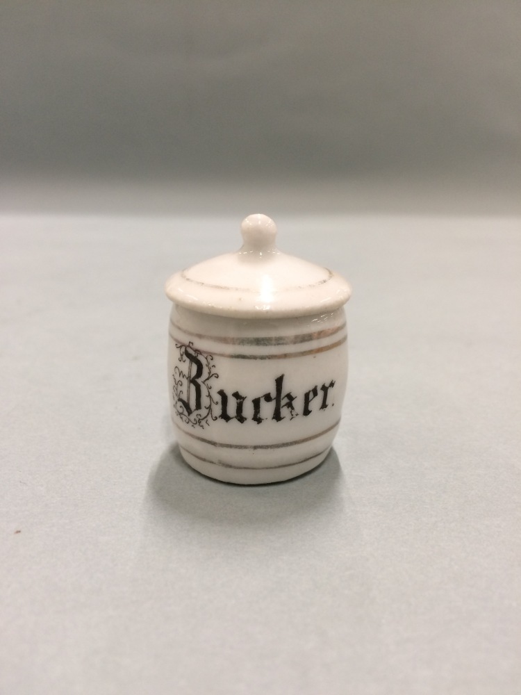 Voorraadvat met deksel met het opschrift Zucker, onderdeel van vijf porseleinen miniatuur voorraadvaatjes met deksels met opschriften