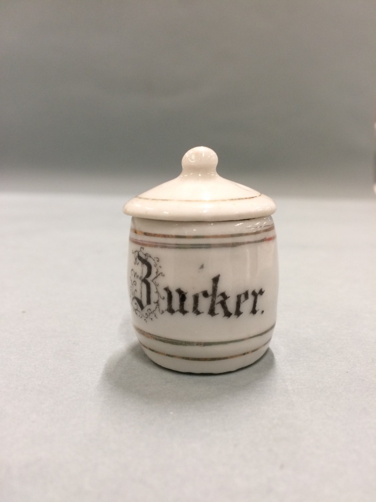 Voorraadvat met deksel met het opschrift Zucker, onderdeel van vijf porseleinen miniatuur voorraadvaatjes met deksels met opschriften