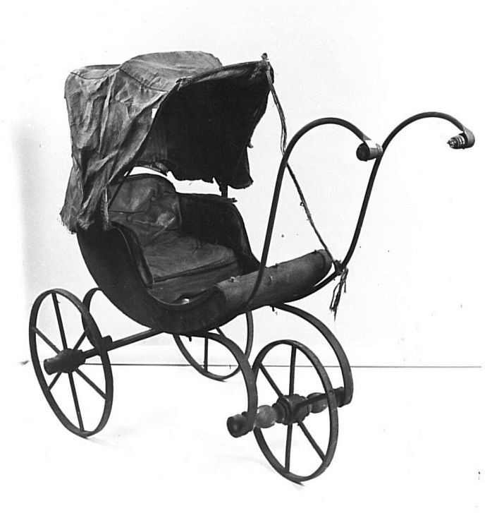 Deel van kinderwagen met één klein wiel voor en twee grote wielen achter, het voorwiel heeft een houten as, de achteras is van metaal