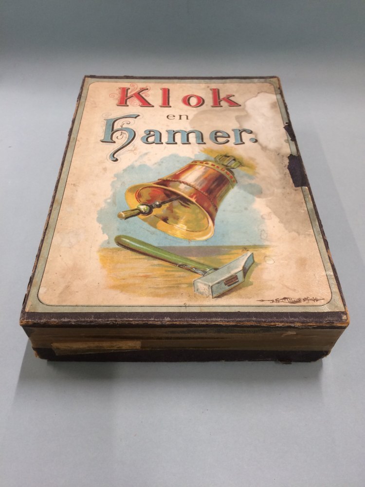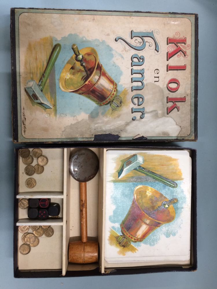 Klok- en hamerspel, bestaande uit vier kaarten, vijf zwarte dobbelstenen, houten hamer en metalen bak met 22 kartonnen muntjes in doos
